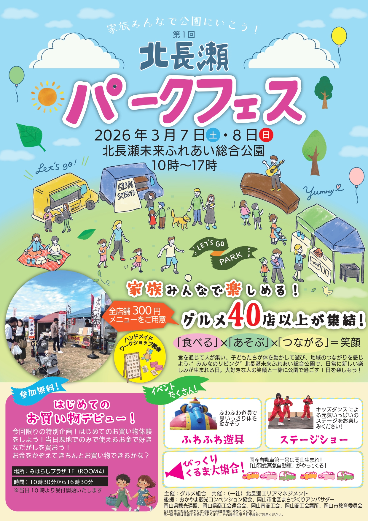 ●駐車場:北長瀬未来ふれあい総合公園の第1・第2・第3駐車場がご利用いただけます。(有料)