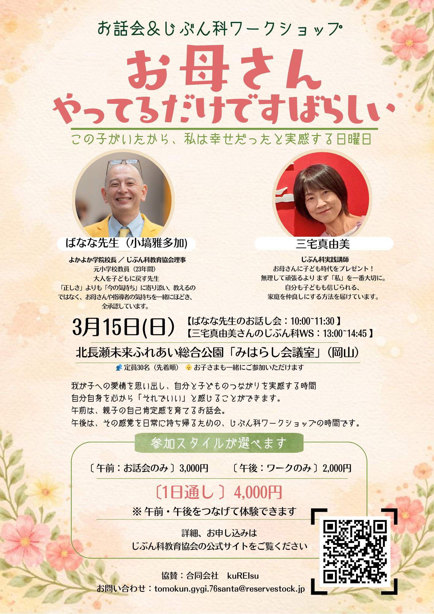 - 午前:お話会のみ〕3,000円【午後:ワークのみ〕2,000円 〔1日通し〕4,000円 ※午前・午後をつなげて体験できます